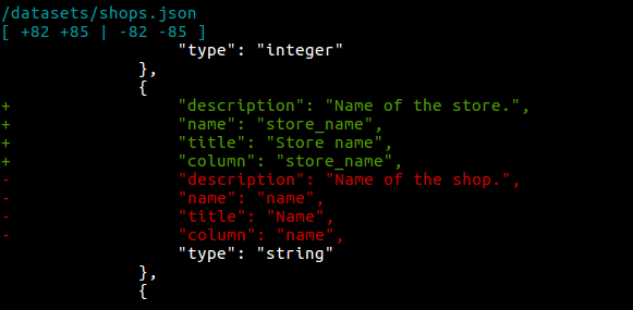 This means lines 82-85 in the dump object have been added (+) in favour of lines 82-85, which have been removed (−) from the remote object.