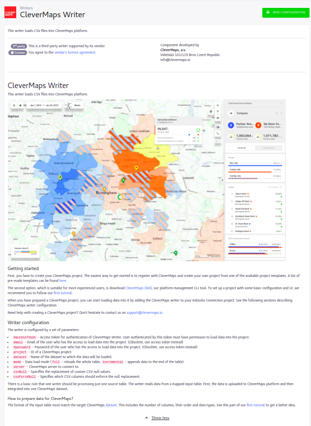 Follow the instructions of the CleverMaps Writer and create a new configuration. Basically you define a projectId, credentials and the destination dataset of the CleverMaps project, where the data from our Google Sheet will be loaded.