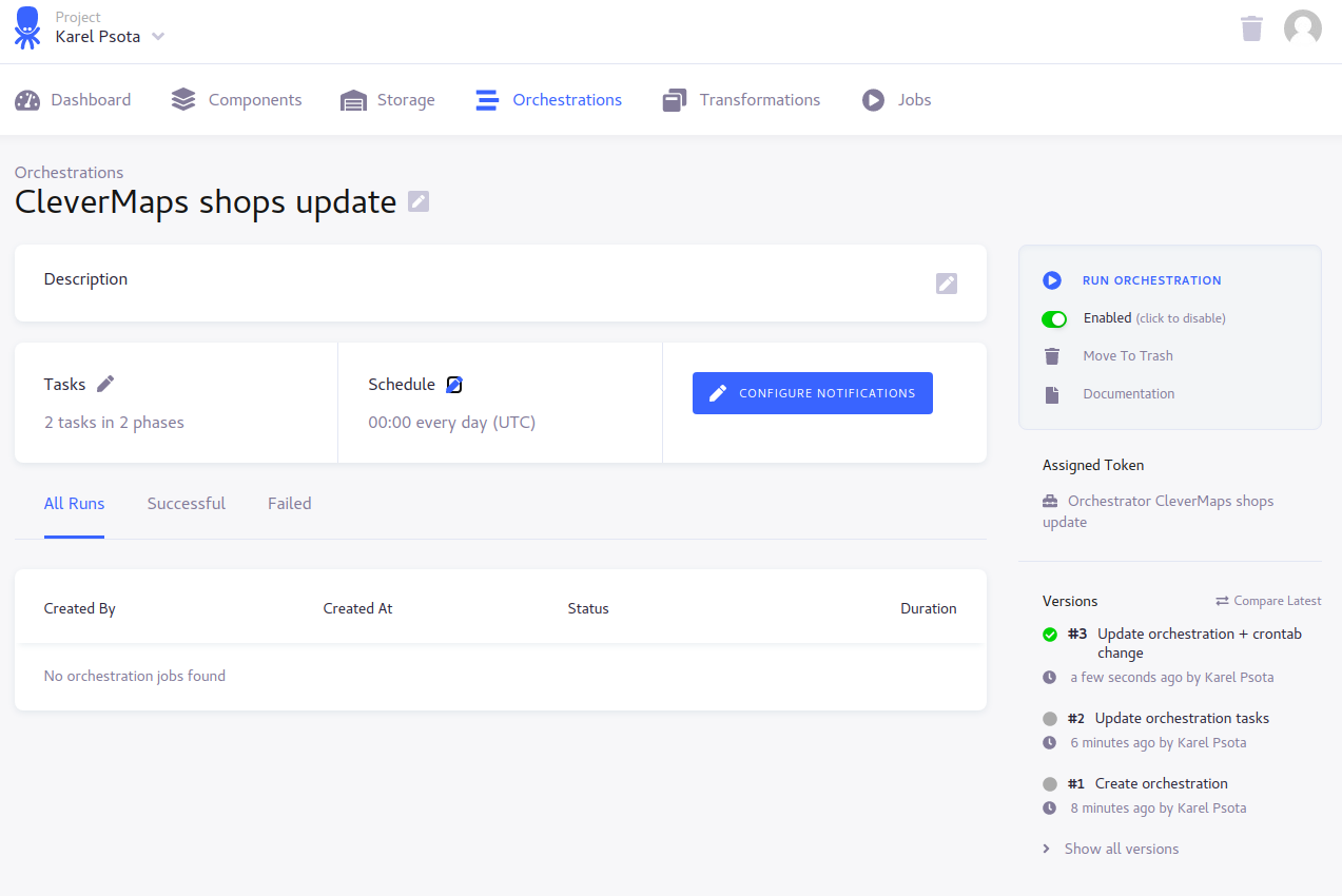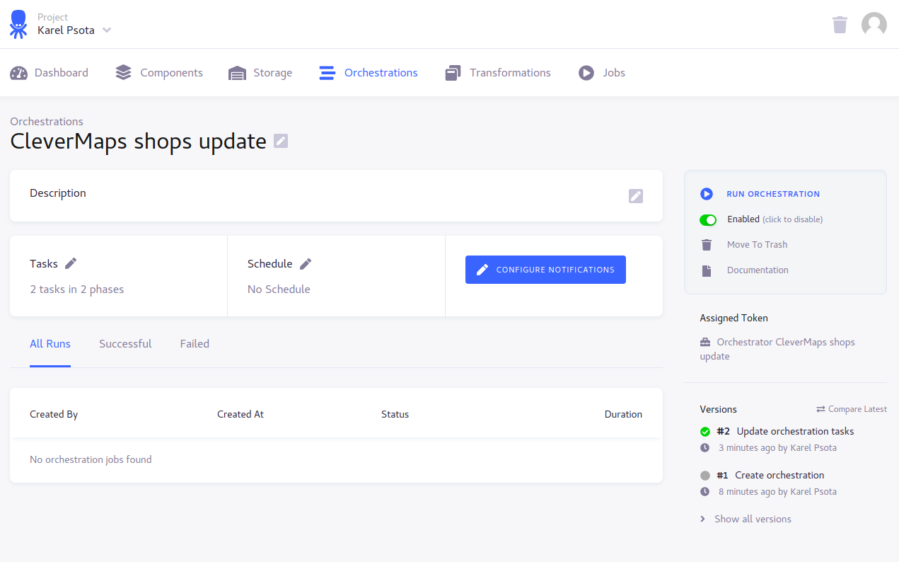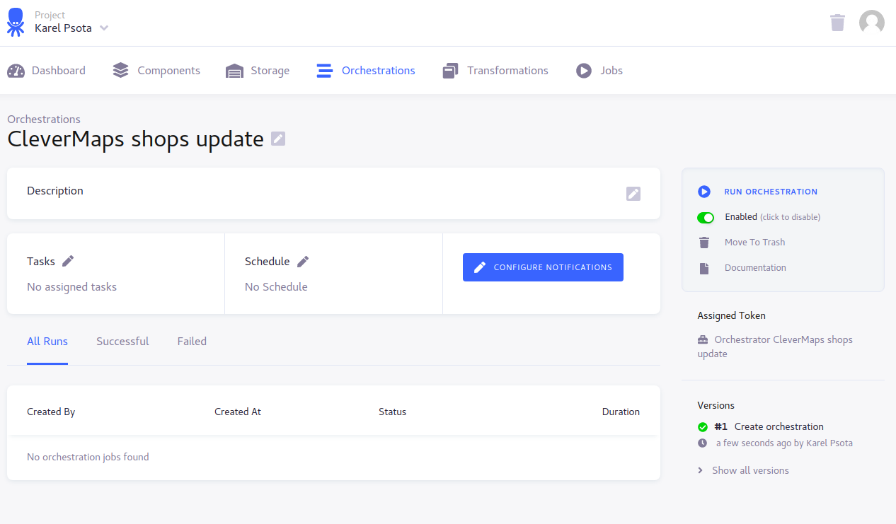 We will create a new free Keboola project, then we will setup a Google Drive Extractor for getting the data from our shared Google Sheet, then we will setup a CleverMaps Writer for loading the data from Google Sheet into the CleverMaps platform. Finally we need to create an Orchestration which will glue our extractor and writer together and we will also setup a schedule of the orchestration.