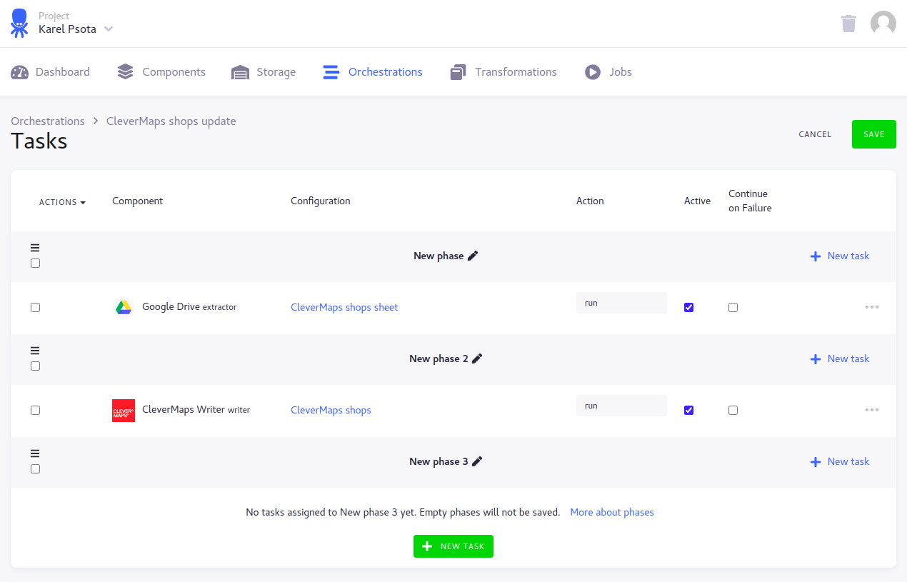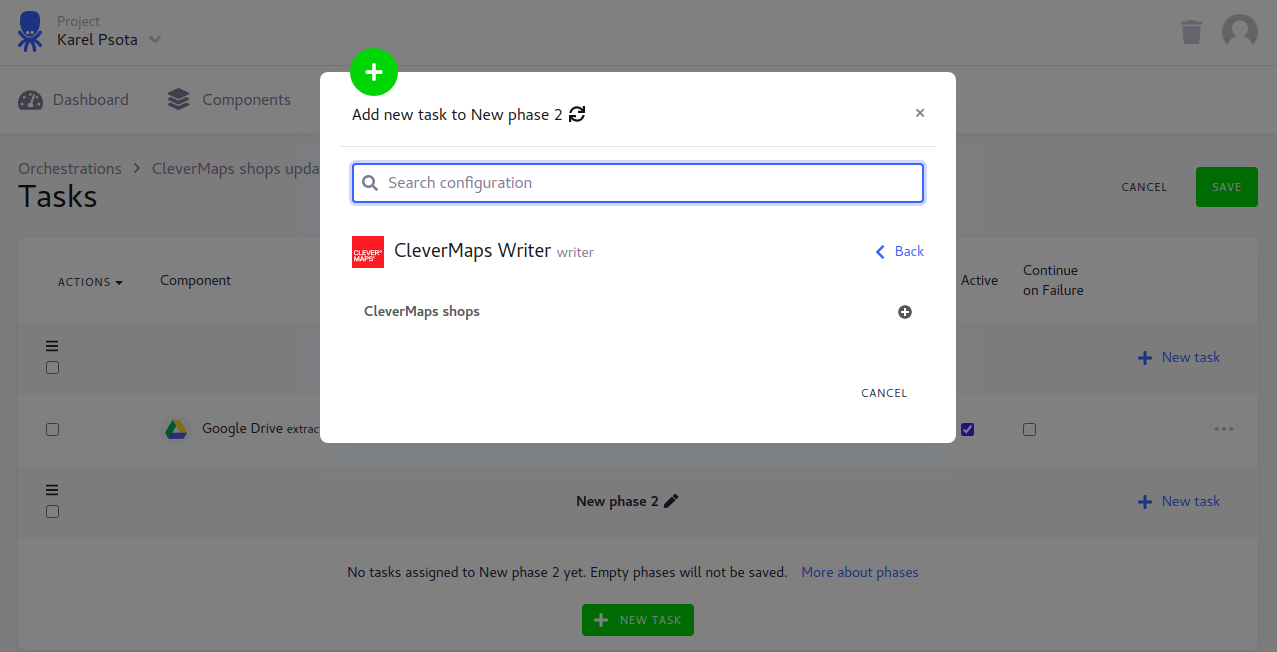 First of all we will add our Google Drive Extractor and CleverMaps Writer configuration. Click edit pencil icon of the “Tasks“