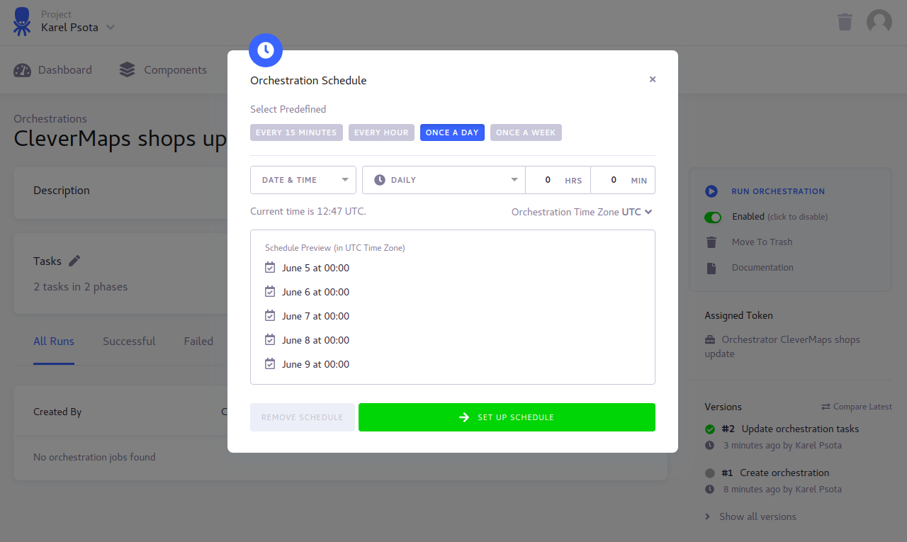 Now is time to setup the schedule of the orchestration. Using a schedule we are telling the Keboola when the data update process should be executed. Click edit pencil icon of the “Schedule“ and setup a day and time according your needs. In our case is it Once a day at 00:00.