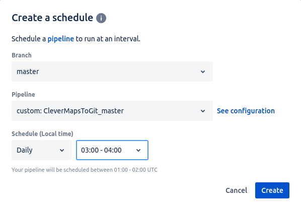 In case you have set up your repository with Bitbucket, you have to create a schedule for the CleverMapsToGit_master workflow on the master branch. See how you can create a schedule in Bitbucket.
