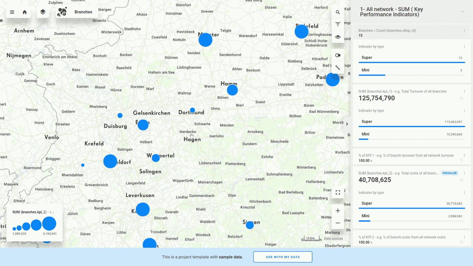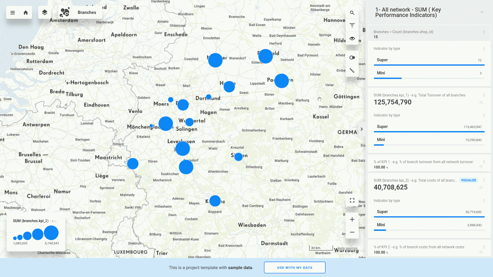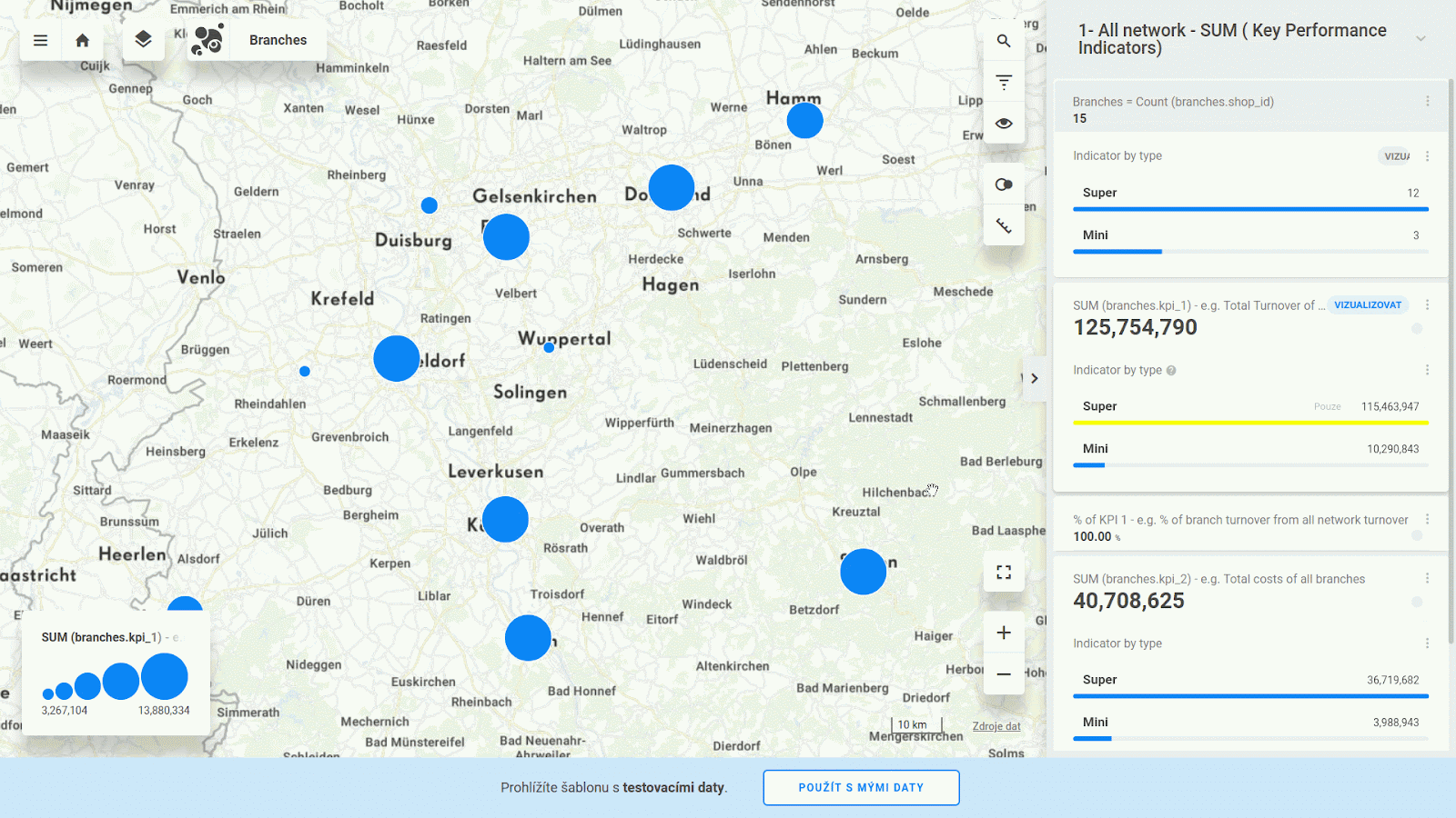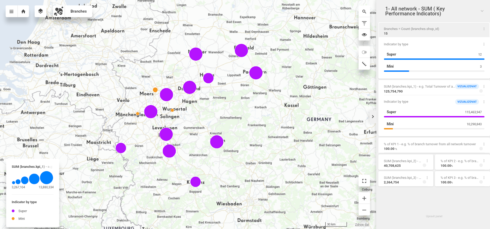 Or even you can select your branches by spatial query. For example, find out SUM of KPI 1 from branches in 36 km radius distance around town Hagen.