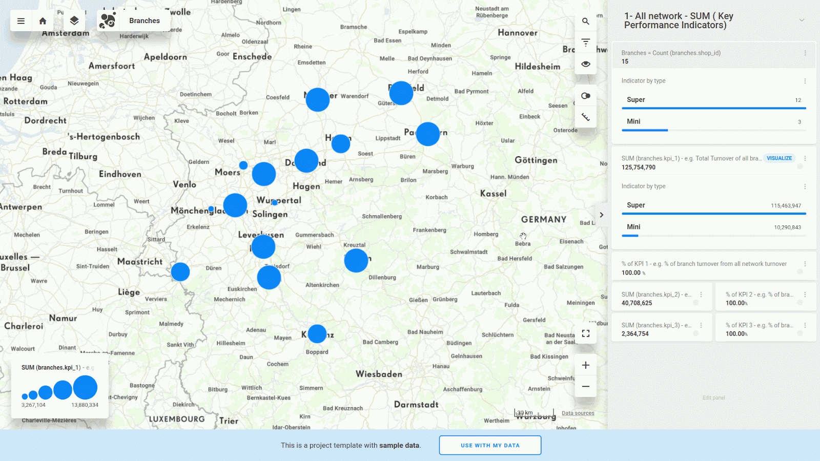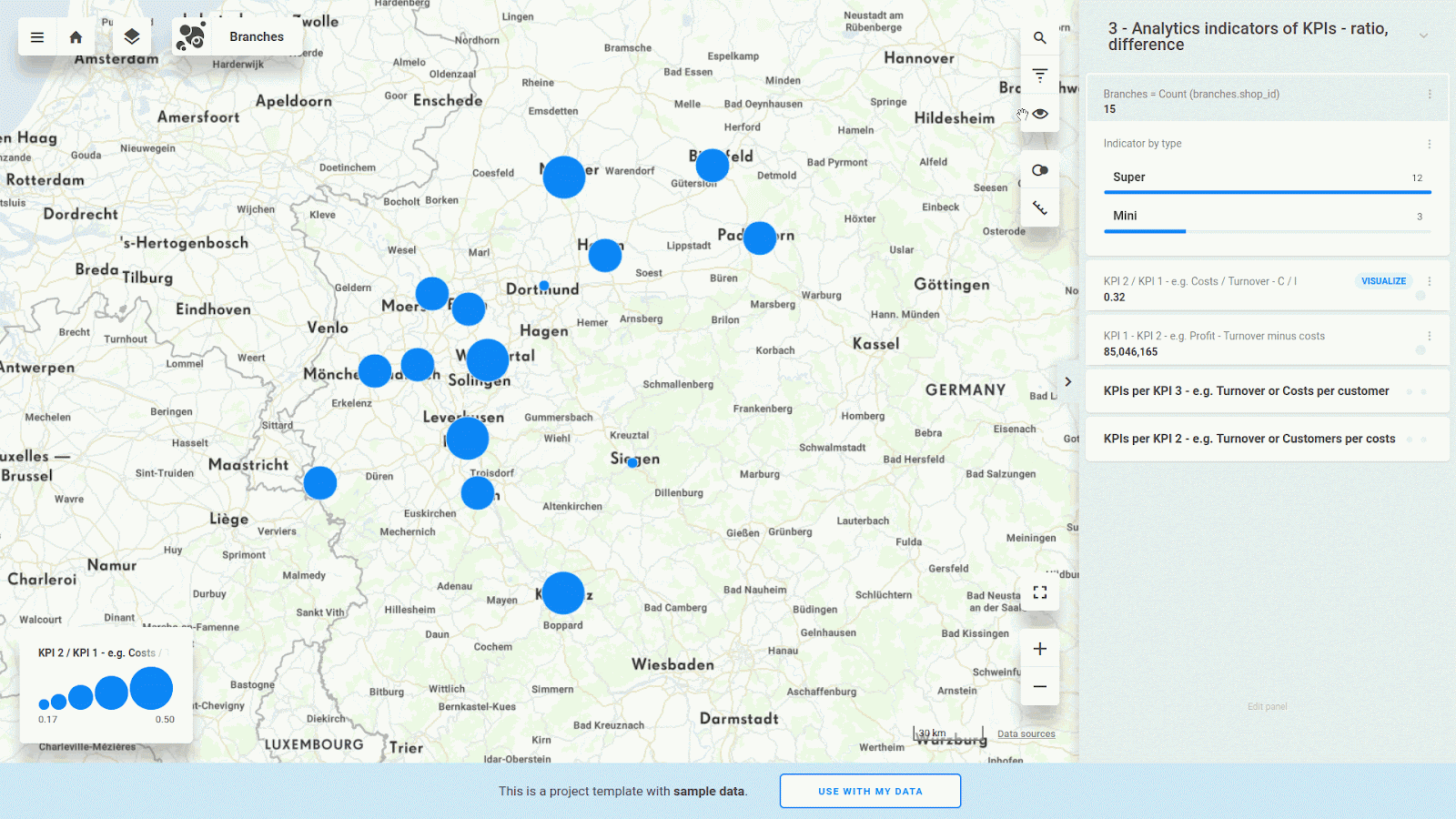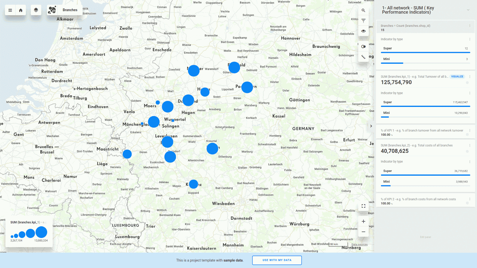 Or even you can select your branches by spatial query. For example, find out SUM of KPI 1 from branches in 36 km radius distance around town Hagen.