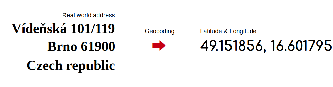 Latitude and longitude values can be obtained directly from a GPS device or derived from real-world addresses. The derivation process is called Forward geocoding.