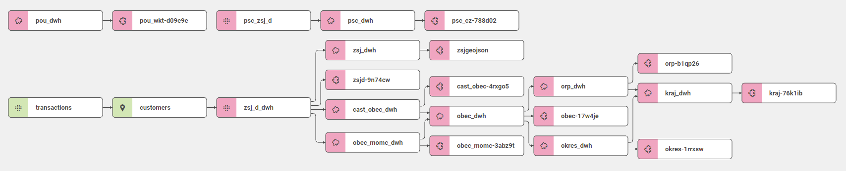 We will import the administrative units' dimensions using the importProject command. This dimension contains the administrative units of the Czech Republic in 7 granularities - regions, counties, municipalities with extended competencies, municipalities, municipalities and city districts, city districts, and neighbourhoods. Each granularity is defined by two datasets - one DWH dataset, and one vector tile dataset. The DWH dataset contains data about the name of the administrative unit, its bounding box (the x_minx_maxy_miny_max properties) and foreign keys to the neighbouring granularities. The vector tile dataset contains a reference to a vector tile service, which contains the polygons for each administrative unit.