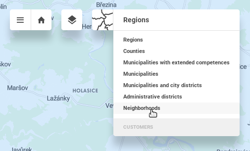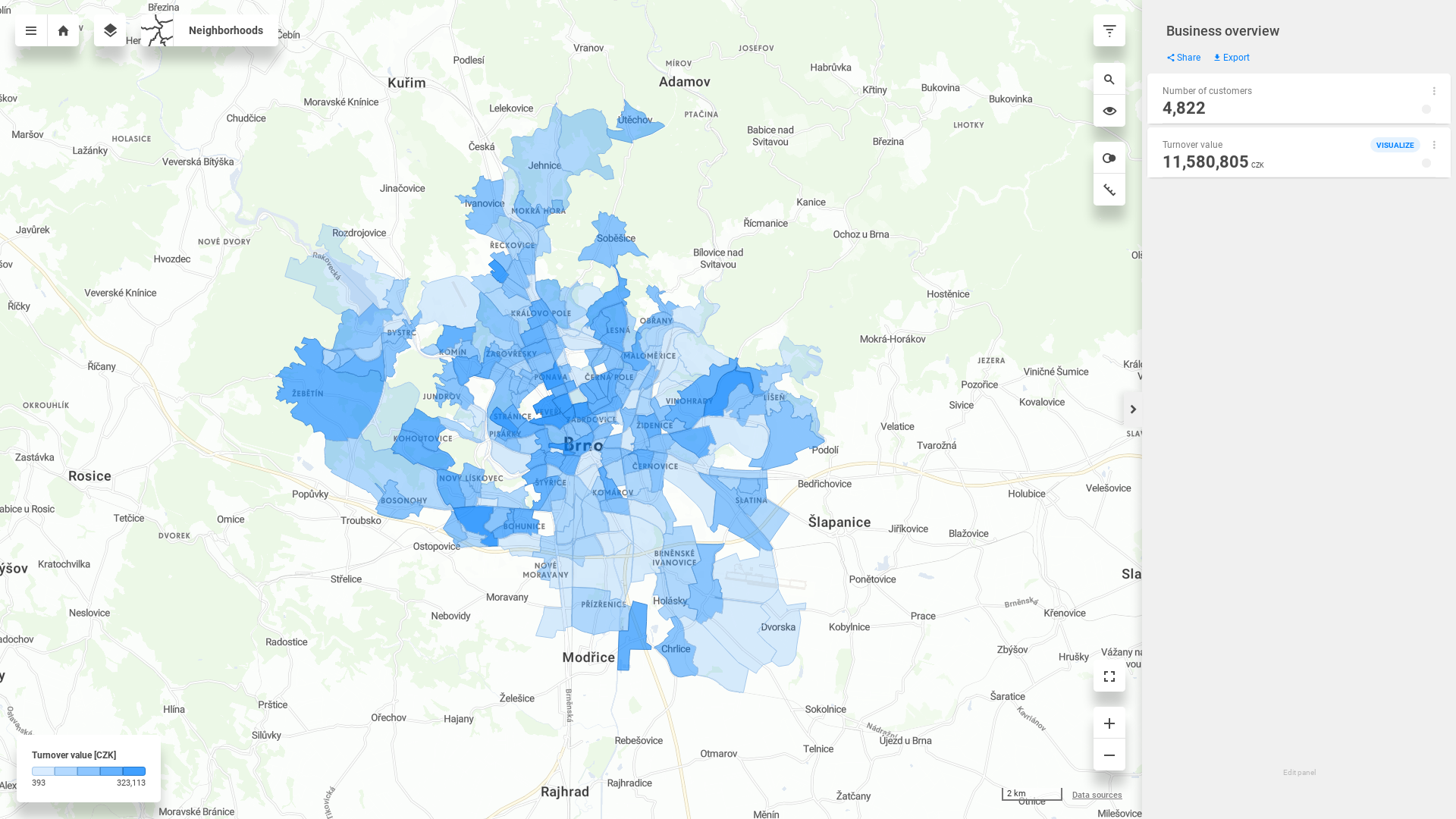 Open the Business overview view and see that the granularity has changed. Administrative units usually have multiple levels. By default, we see the biggest level - Regions. Change the granularity to Neighborhoods in the granularity drop-down menu in the upper left corner.
