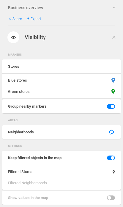Its style will be marker-blue and we will filter it by the store_type property of the stores dataset. We will link it to this dataset in the respective marker selector later. If the property value equals to "Blue", the marker will be blue.