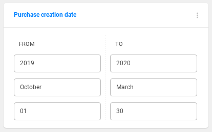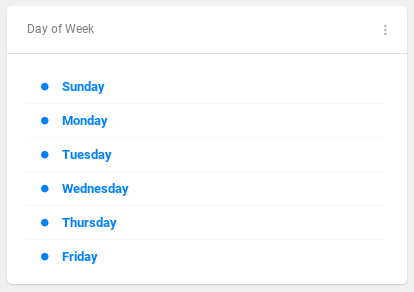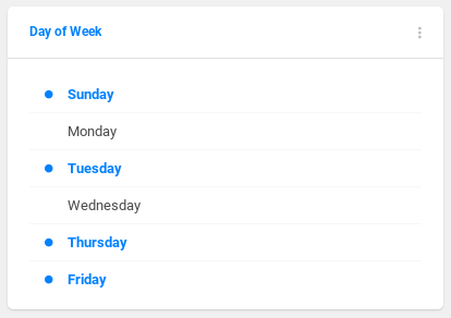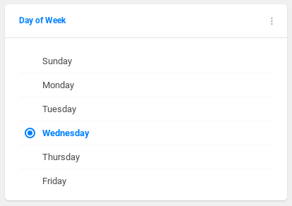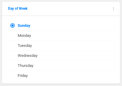 Singleselect filter that works like a radio button. The user can choose only one of a predefined set of options. Used to filter enumeration types (e.g. day of the week, type of the store, etc.).