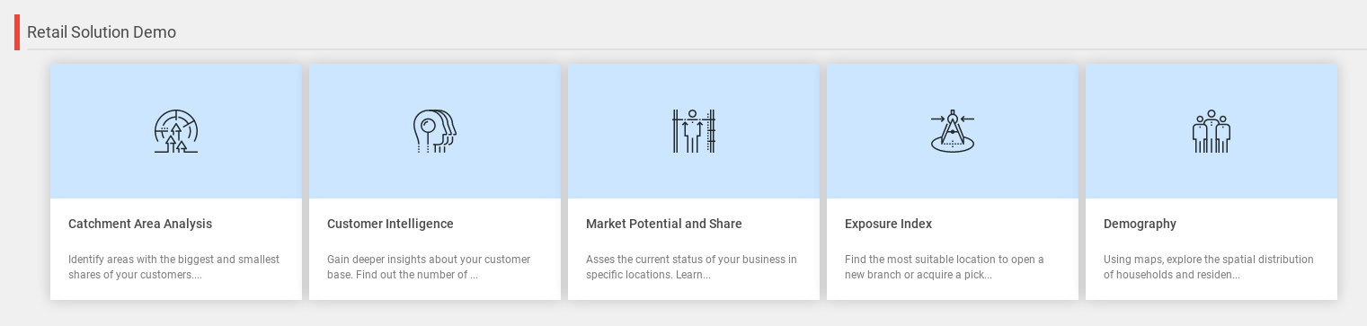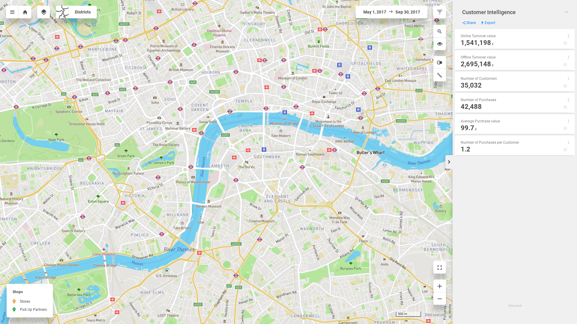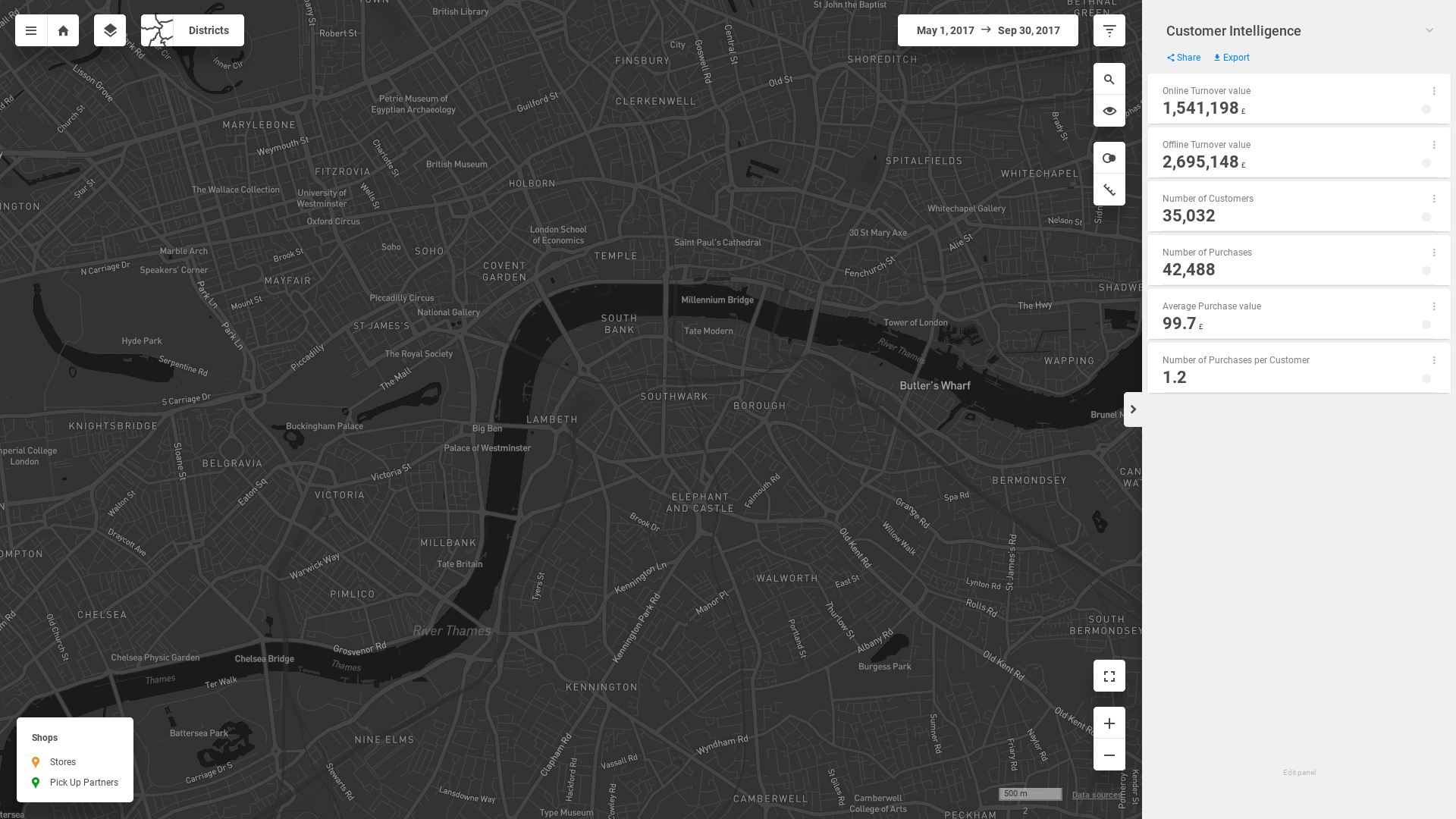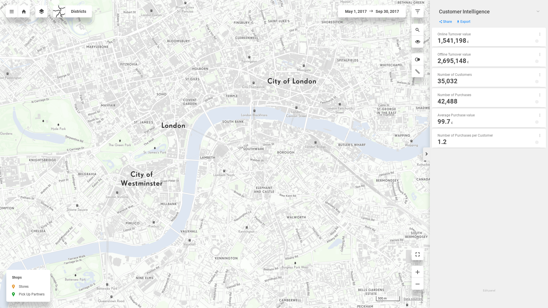 "description": "Identify areas with the biggest and smallest shares of your customers. Find out what turnover these customers generate. Evaluate store rankings and identify the pick-up partners used by customers from different regions. You can also compare the catchment areas for two different stores.",